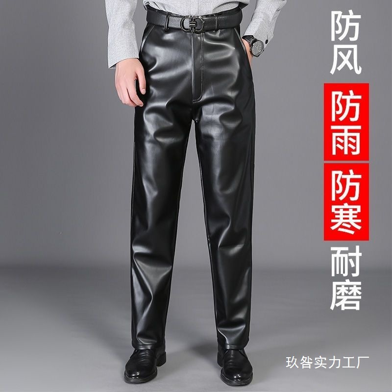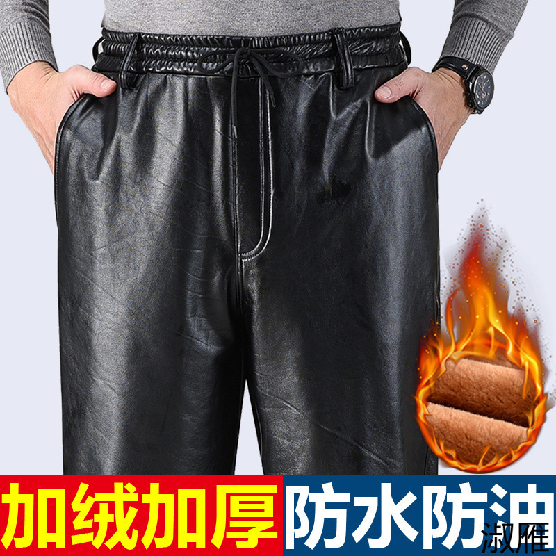 秋冬の皮のズボンの男性の防風の防水の中高年の皮のズボンは腰の男性のテイクアウトの騎手のベルベットのストレートのズボンを締めます。
