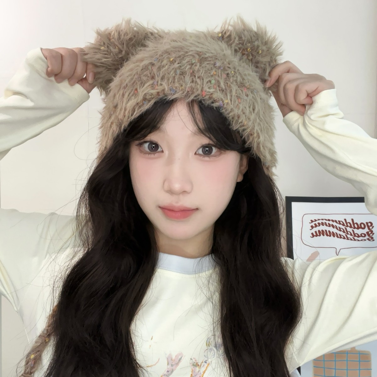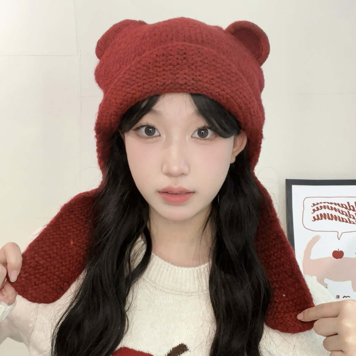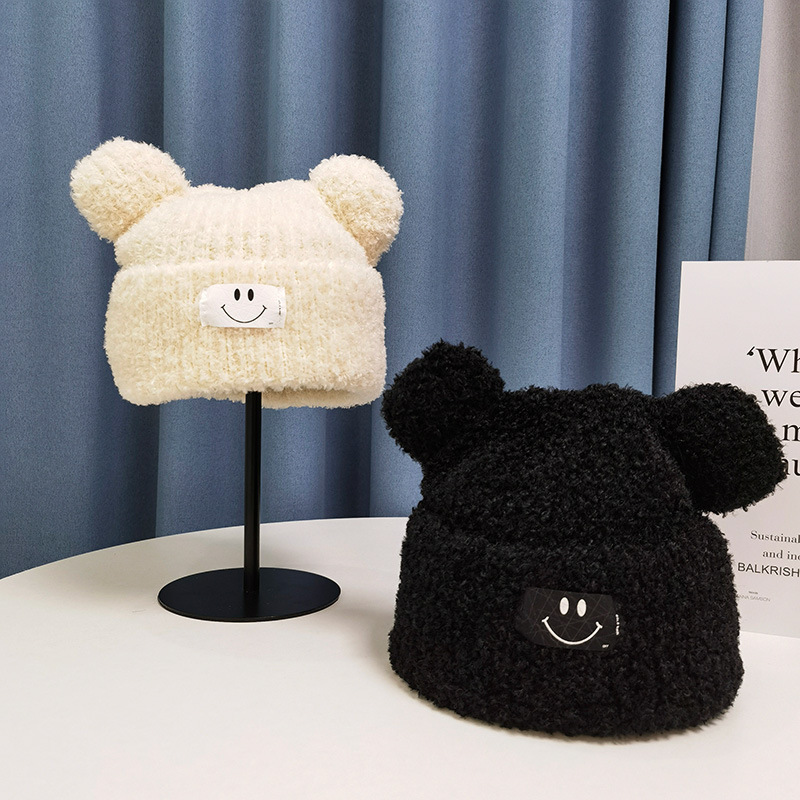 韓国版の笑顔が可愛い毛糸帽子の女性秋冬保温毛玉ニット耳保護熊帽子