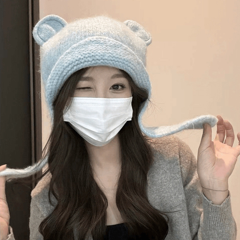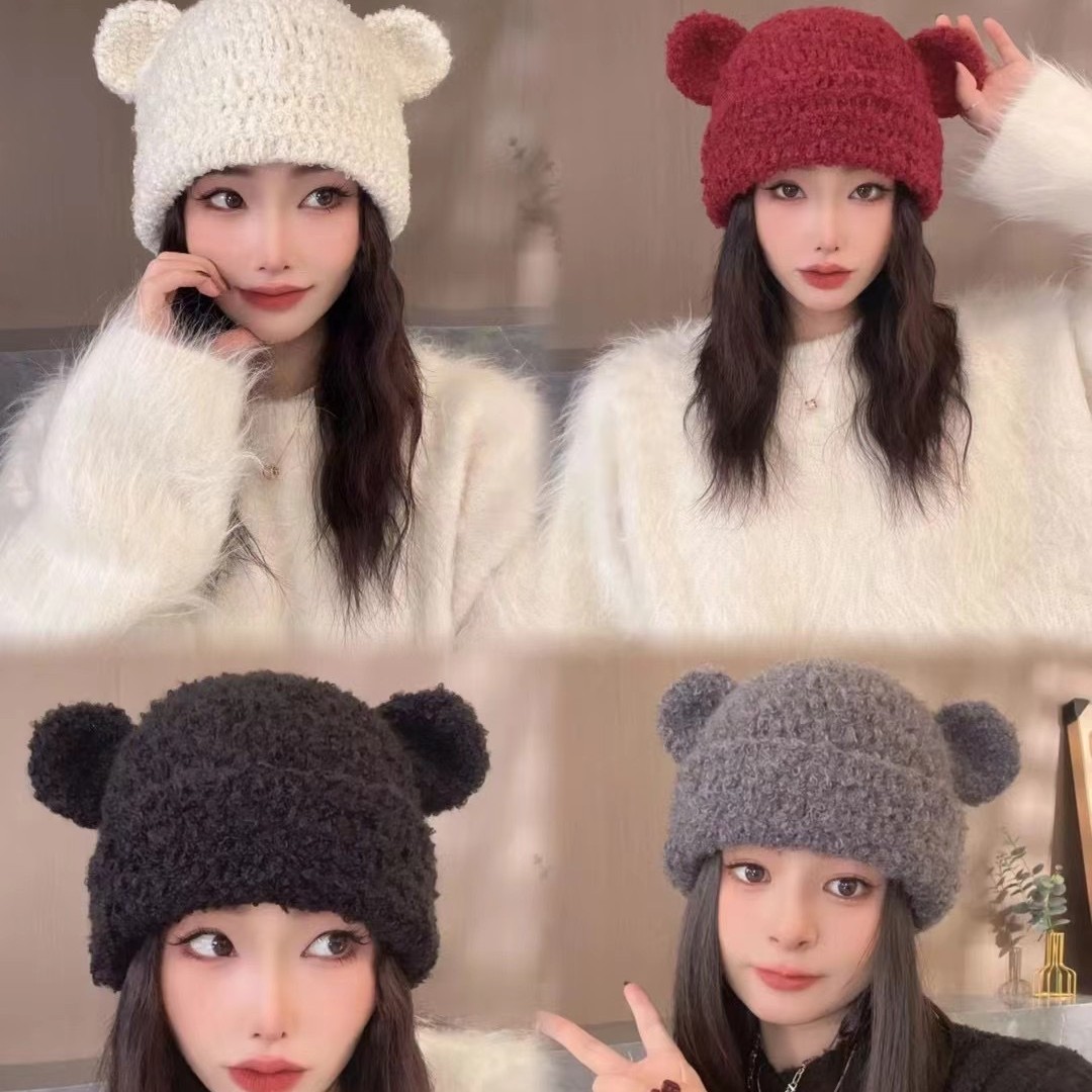 ベルベット帽女性秋冬かわいい耳ベアーins漫画ニット帽厚い毛糸帽保温耳包頭