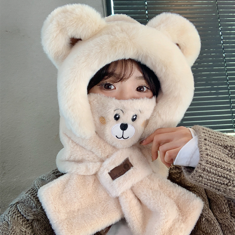 熊のぬいぐるみの帽子のマフラーの一体の女性秋冬の韓国版は顔を見せます。