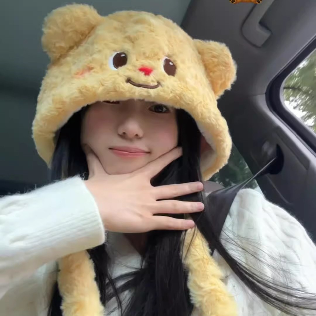 バターの熊の帽子が可愛いぬいぐるみの雷鋒帽子の女性は顔が小さいです。