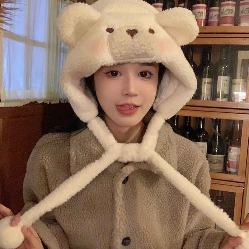 冬の新型帽子韓国版かわいい厚手毛茸熊耳耳耳保護帽子猫耳保温ストラップ保温