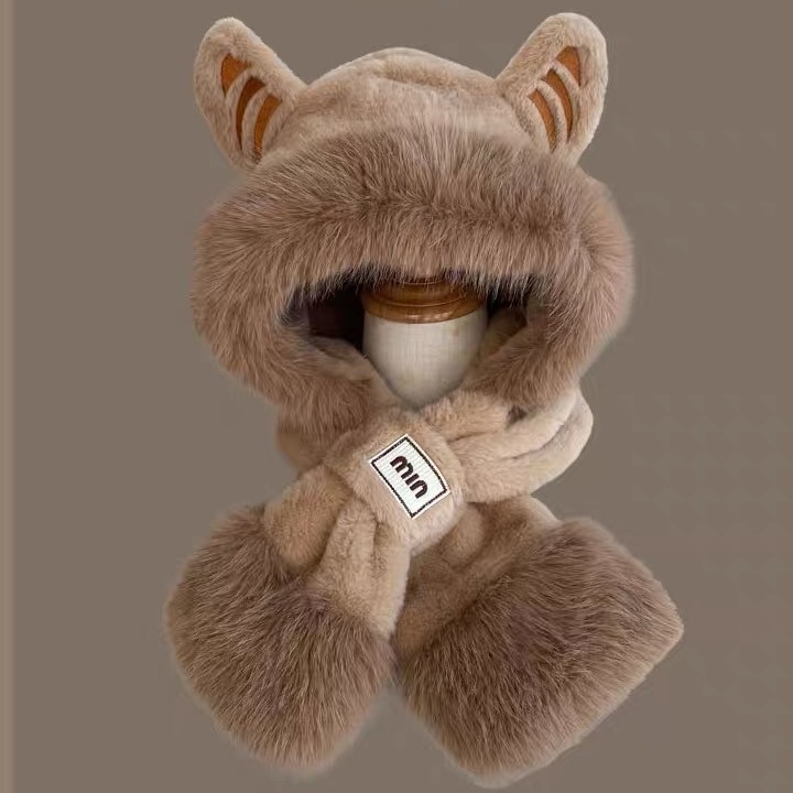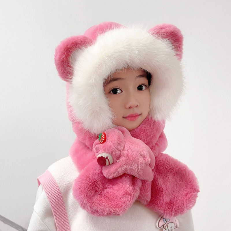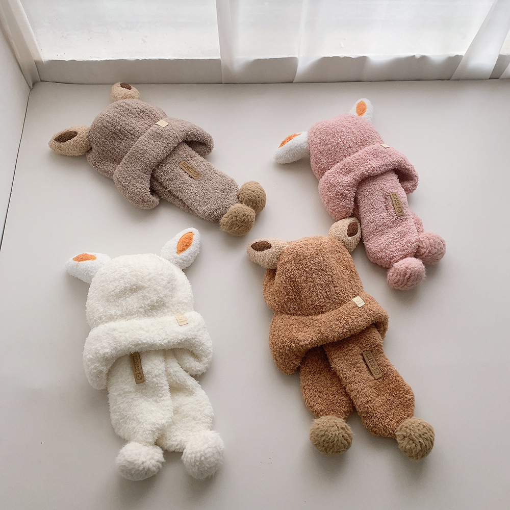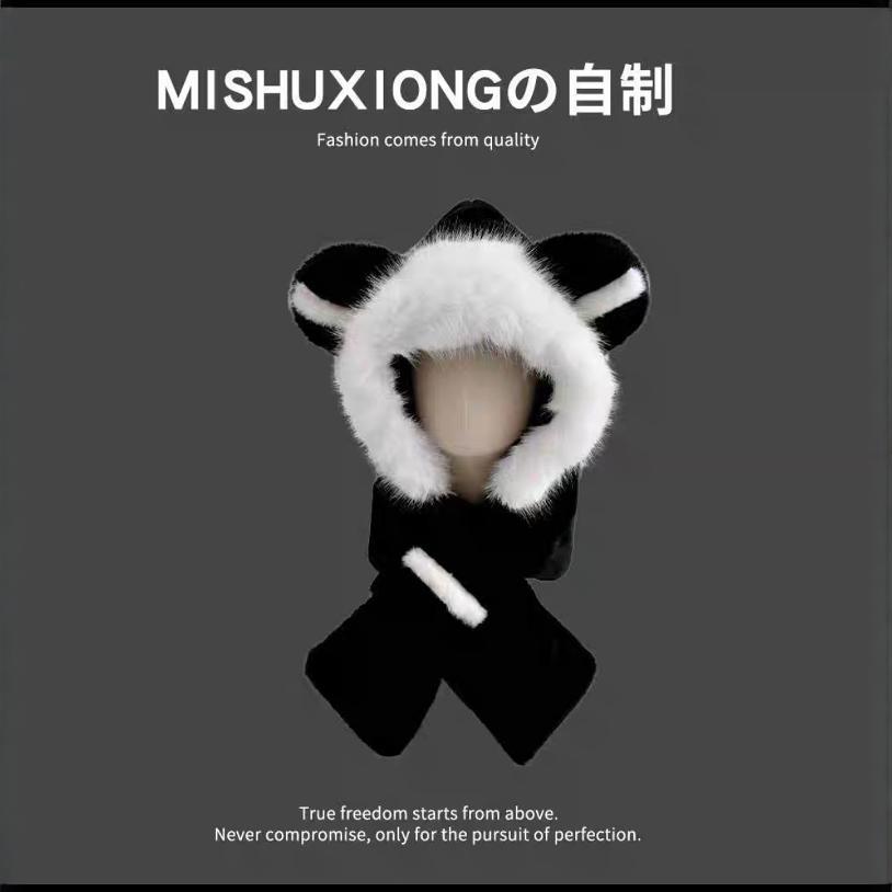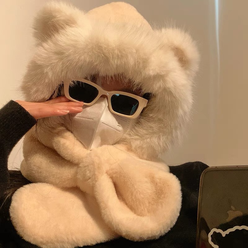 熊帽子冬かわいいマフラー手袋一体冬マフラー帽子女性マスク保温秋冬二点セット