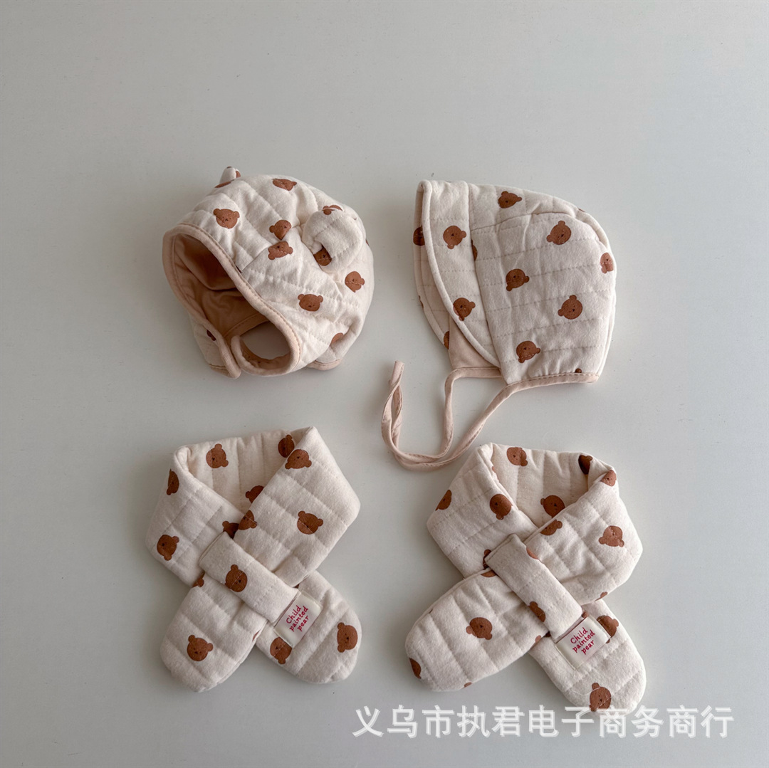 漫画クマぬいぐるみベビー帽子秋と冬のベビー帽子スカーフオールインワン 2 点セット子供の暖かい耳保護帽子