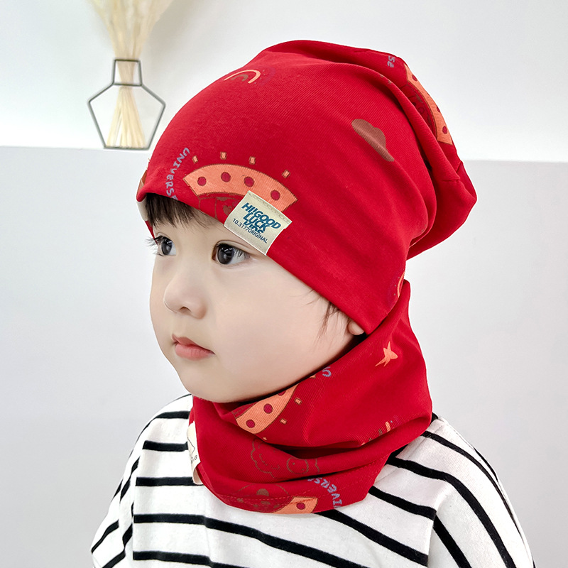 2025年新作 純綿子供用シングルレイヤー帽子とネックスカーフの2点セット 春秋用 布ラベル付き 笑顔 防風 フード付き帽子