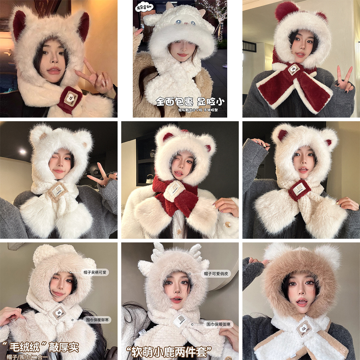 2024新型冬のマフラー帽子は一体二点セットの屋外で厚いベルベット防風保温ヘッドセットのアニメ