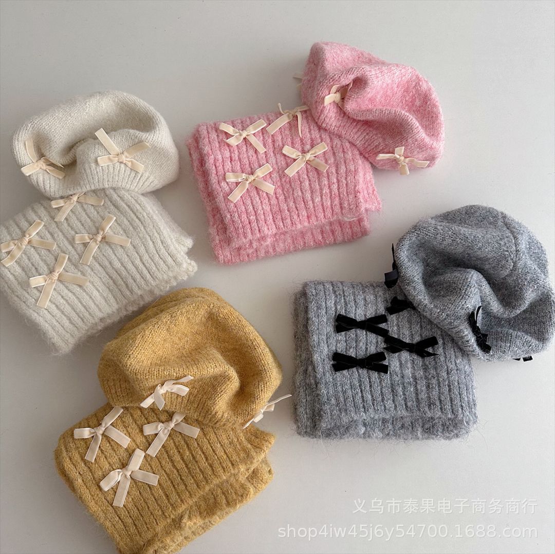 韓国系子供秋冬新作洋気文芸蝶結びベレー帽女の子保温凹造毛糸ニットマフラー