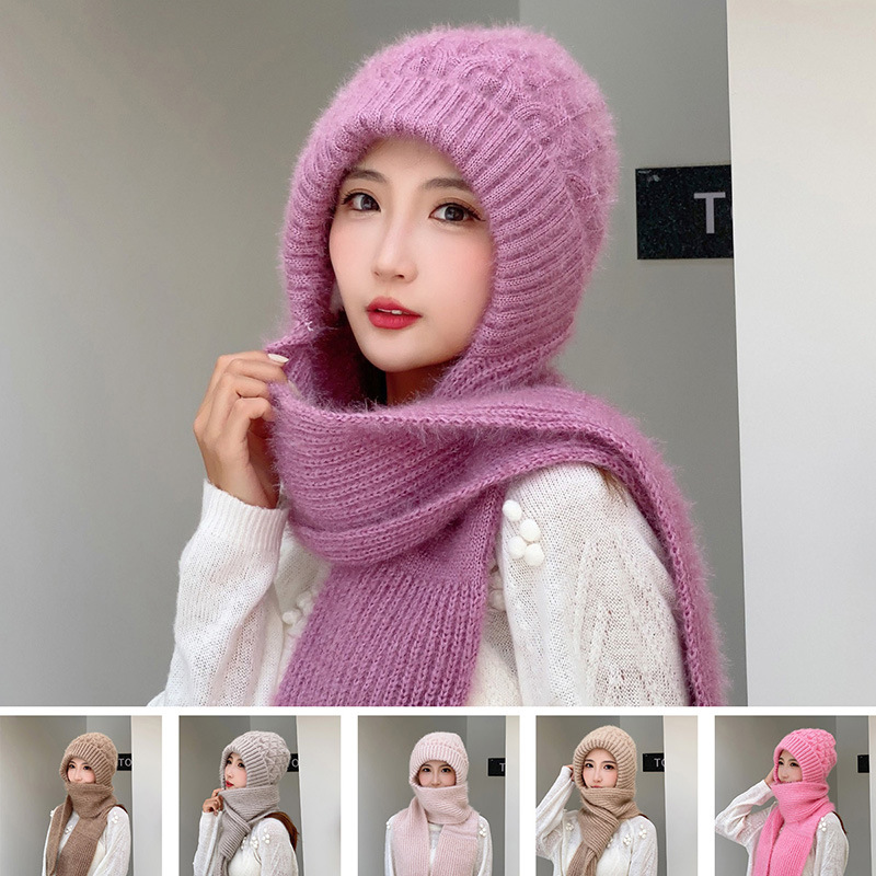 スカーフ一体型ベルベット厚みのある女性用暖かい新しい帽子冬の耳保護と顔保護ニットウールフード付きスカーフ