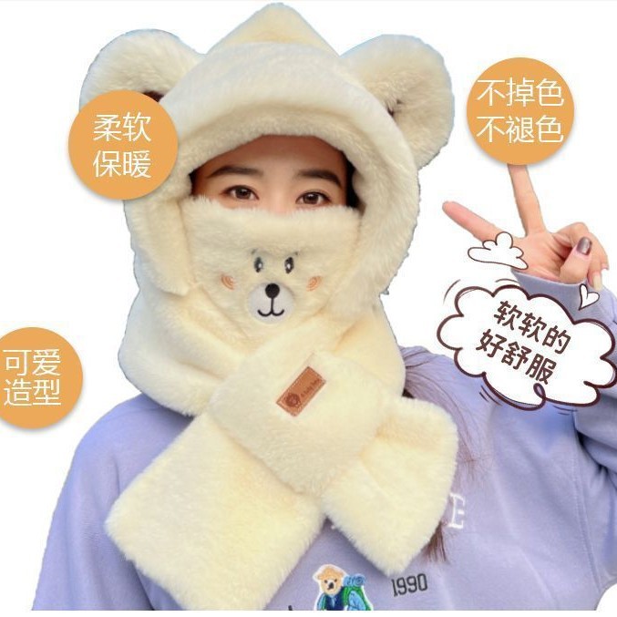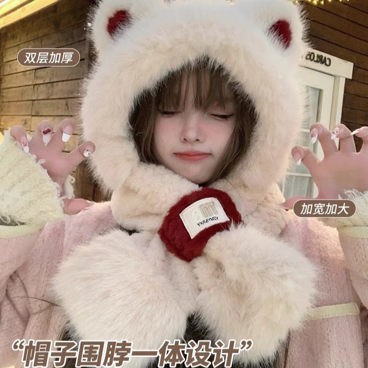 熊帽子マフラー三点セット女性冬ファッションかわいい学生ぬいぐるみ保温マフラー手袋一体帽子