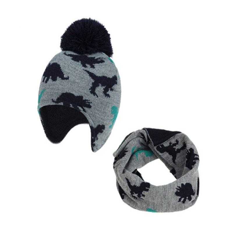 源工場越境EC子供用ベビーネックウォーマー2点セット大型恐竜耳当て付き裏起毛二重帽子スカーフ