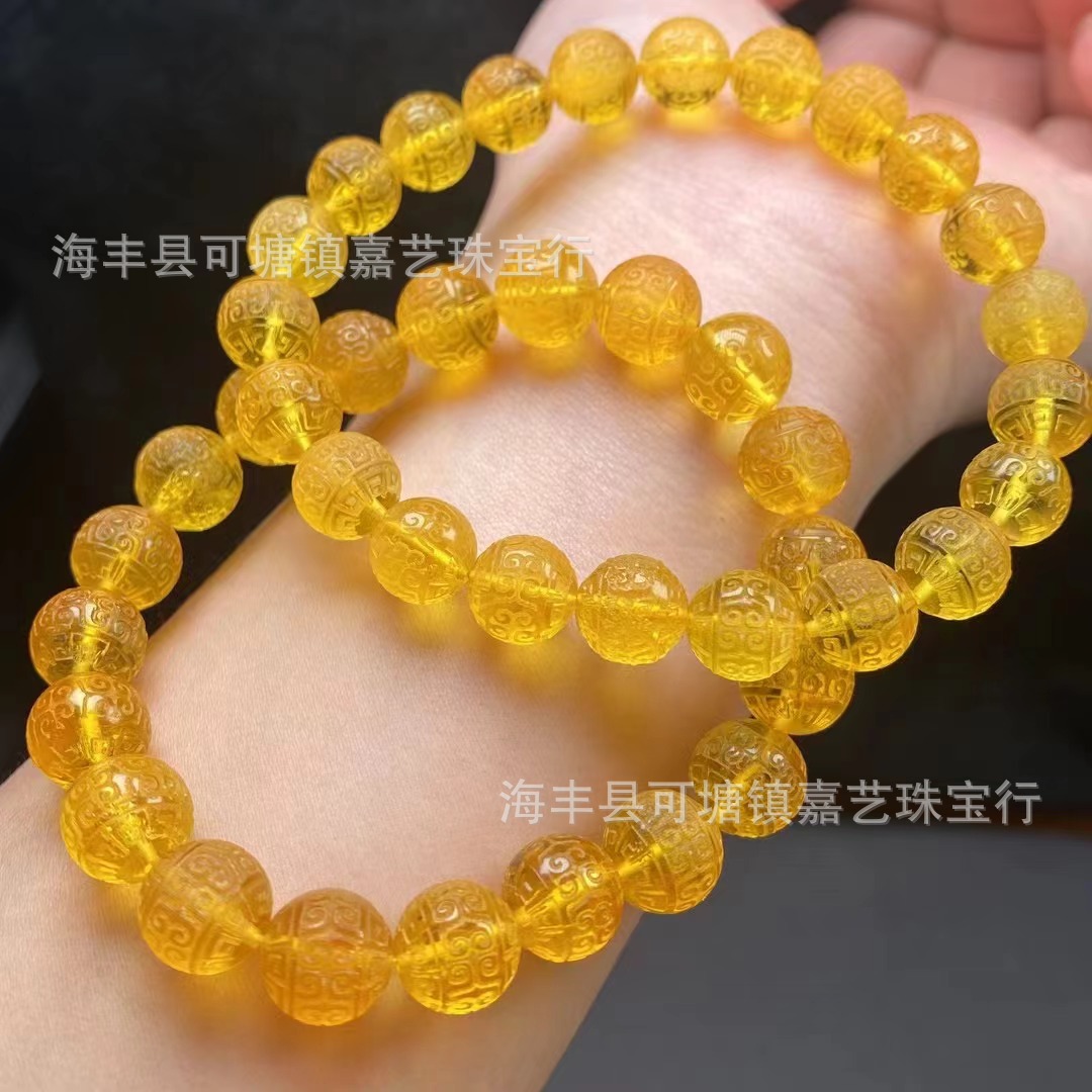天然琥珀ロシア材料蜜蝋鶏油黄精雕回紋珠ブレスレット9mmブレスレットアクセサリーは卸売りに適している