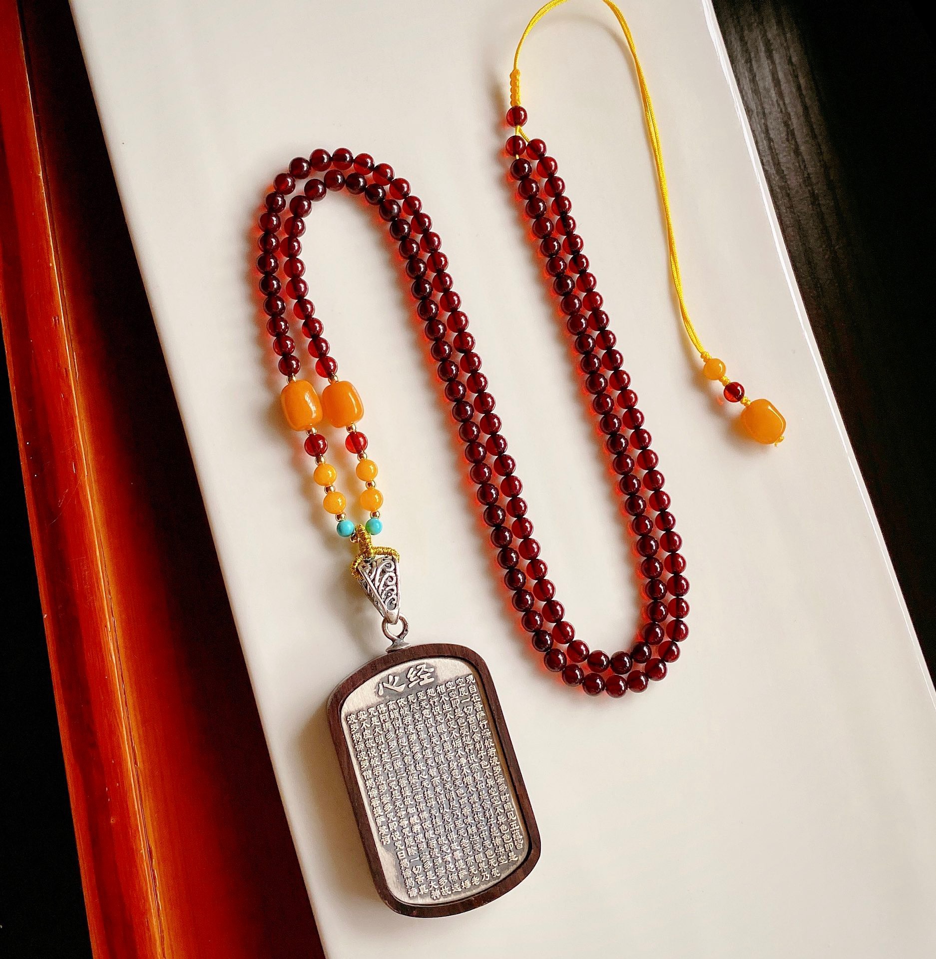 天然黒檀木足銀心経ペンダントと血パーオリジナルビーズチェーンとミツロウ緑松石オリジナルネックレス