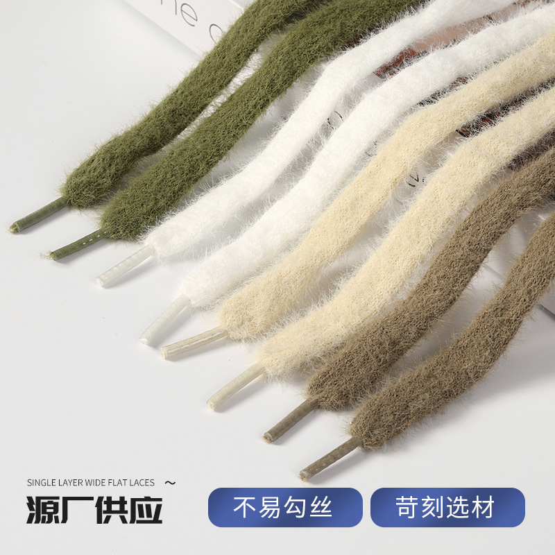 卸売ミンクファー織り紐、毛皮靴紐、ふわふわ靴紐、無地白靴紐、スニーカー、ボードシューズ、靴紐