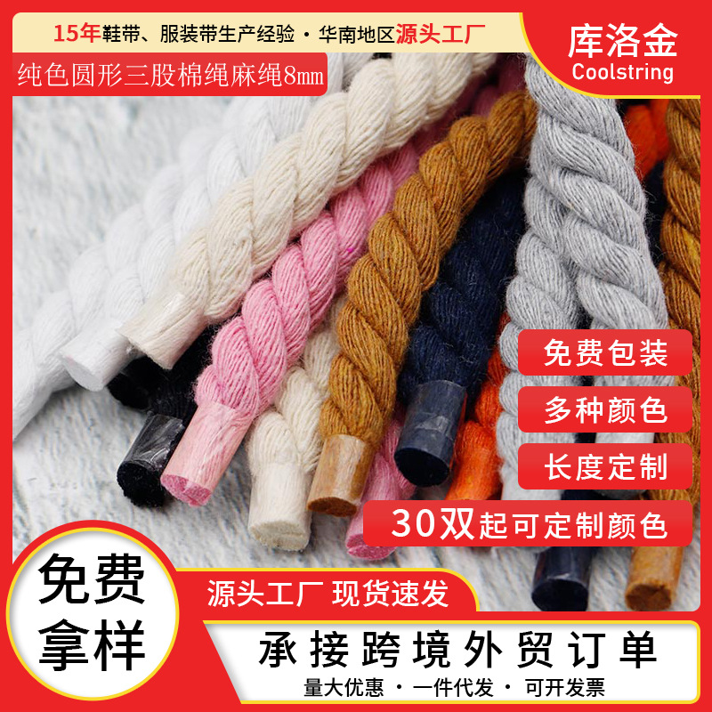 クーロ金靴ひも卸売り8mm手編み補助材料diy三本綿ひもカラー太く純綿麻花飾り