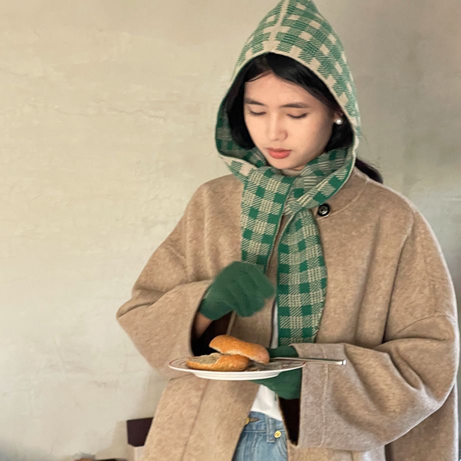 2023秋冬多機能一体帽子マント法帽子両用格子韓国版百合厚保温マフラーニット
