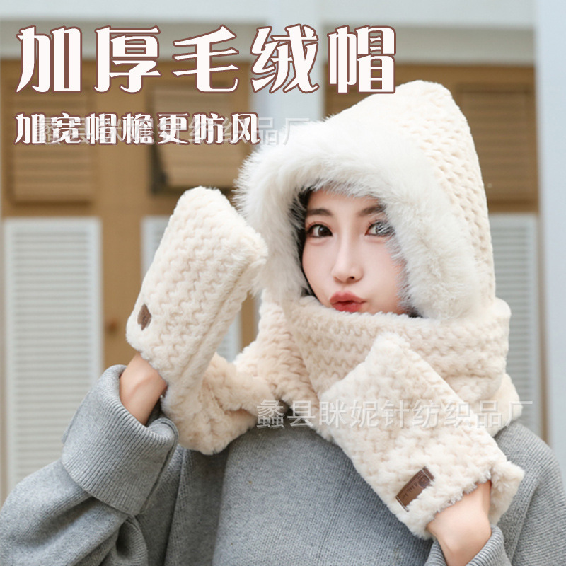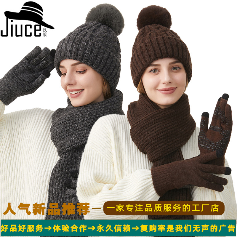 秋冬毛糸帽子マフラー手袋三点セット保温二重ベルベットニット女性ニット帽子クロスボーダー