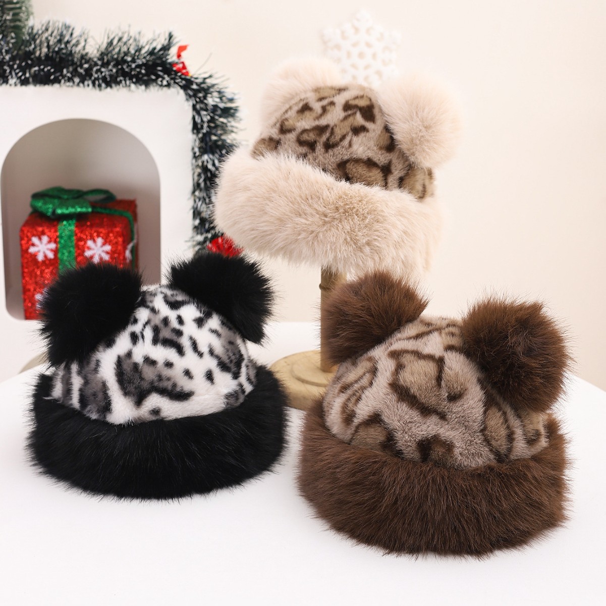ファッショナブルなヒョウ柄クマ耳ぬいぐるみ帽子秋と冬厚く暖かい耳保護プルオーバー帽子甘くてクールな多用途モンゴル帽子
