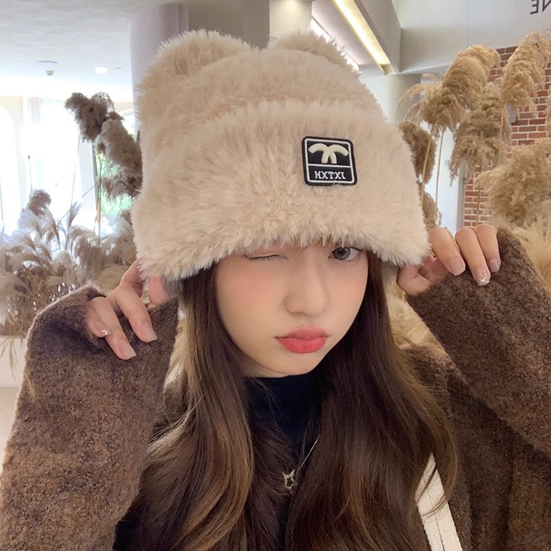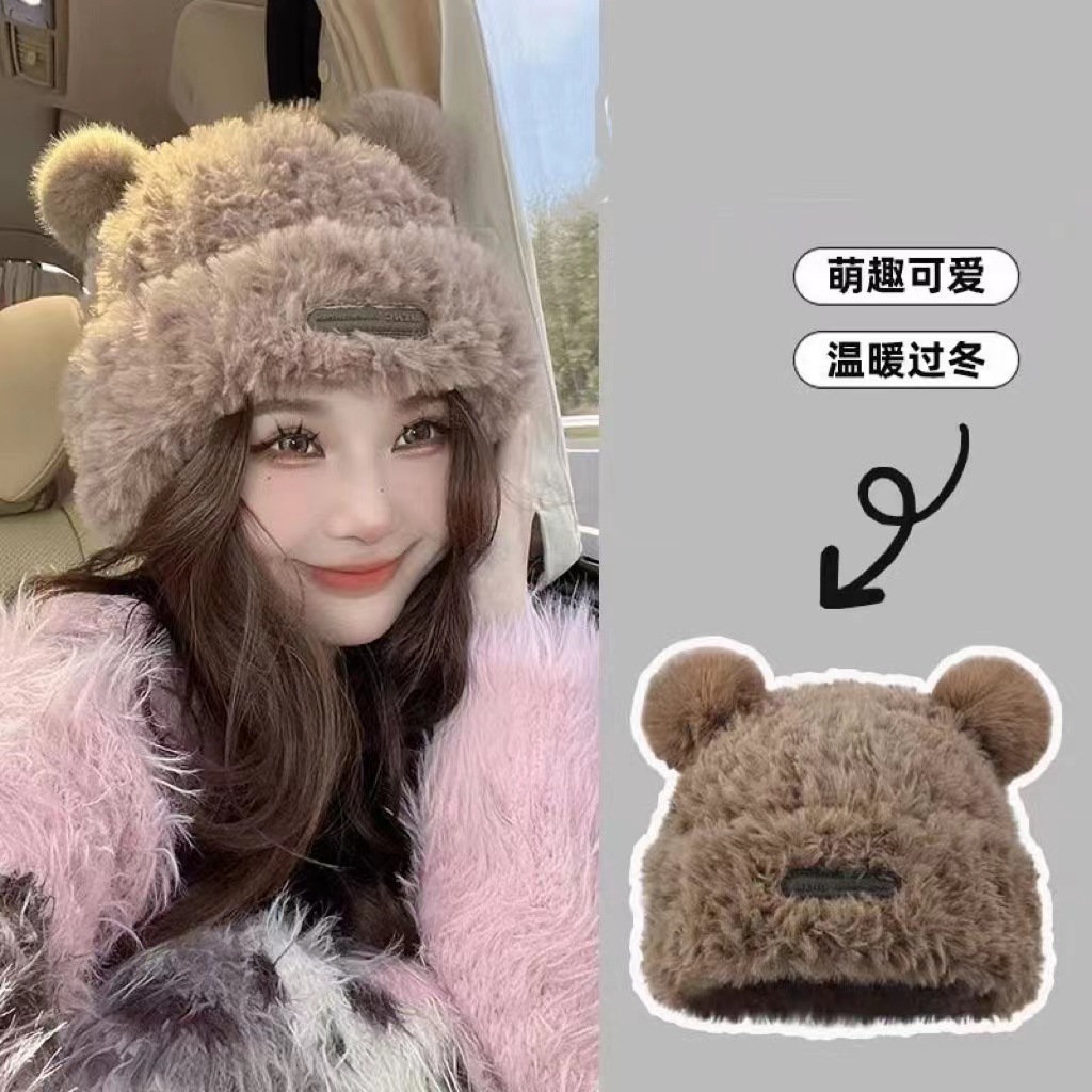 2024新款防风雪冬甜美毛绒可爱小熊毛线帽子骑车护耳保暖雷锋帽