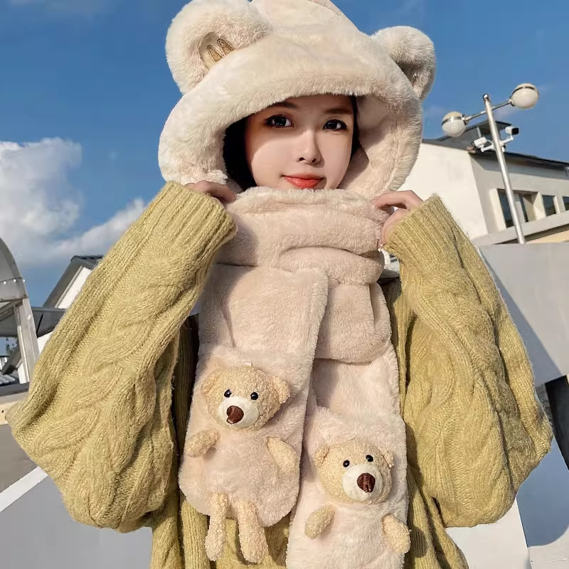 秋冬熊三点セットの厚い帽子耳保護保温帽子マフラー手袋三合一高坪量のぬいぐるみ帽子