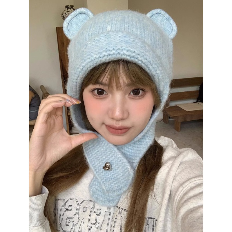 かわいい熊の耳の青いニットの毛糸の帽子の女性の2024年の秋冬の顔の小さい帽子の保温の耳の帽子