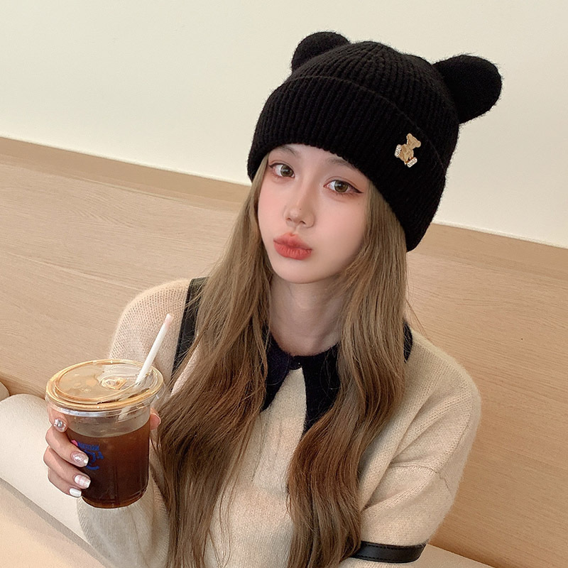 ニット帽子クマかわいい甘い耳女性韓国スタイル耳保護大きな頭囲ソフトワックス多用途暖かい帽子和風帽子