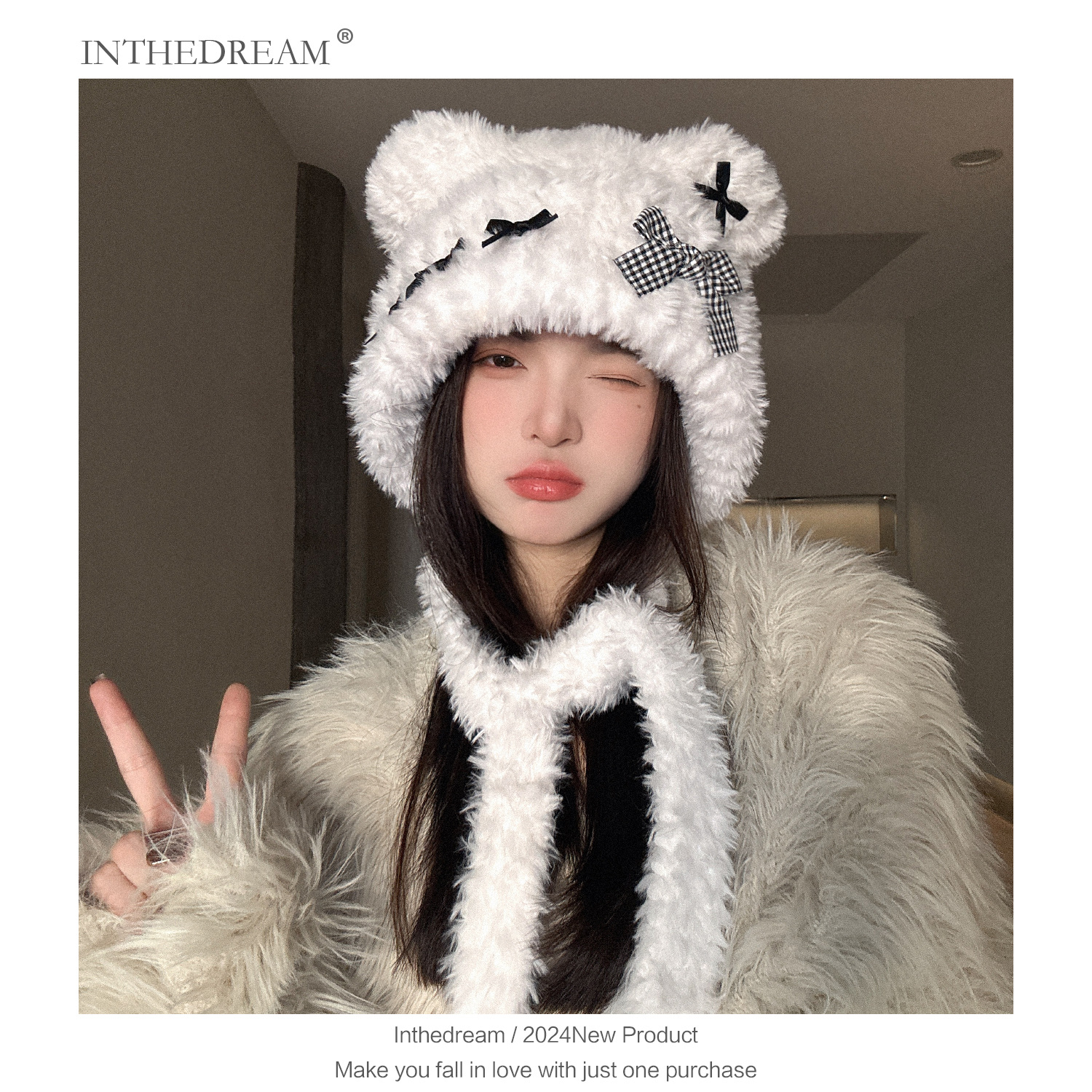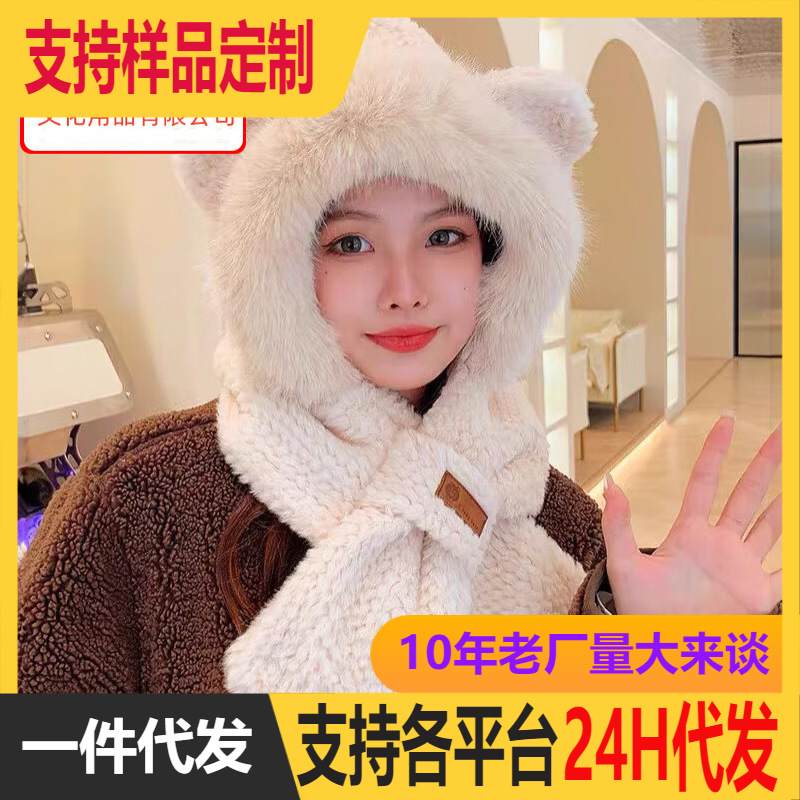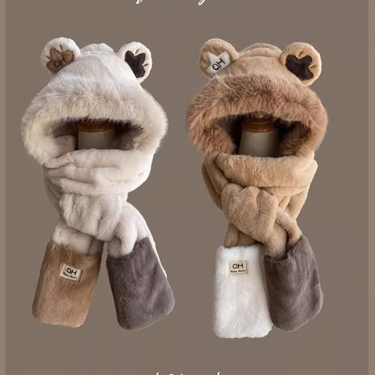 かわいいクマの帽子とスカーフオールインワン女性の冬の雷峰帽子女性の冬プラスベルベット暖かい耳保護防寒帽子トレンディ