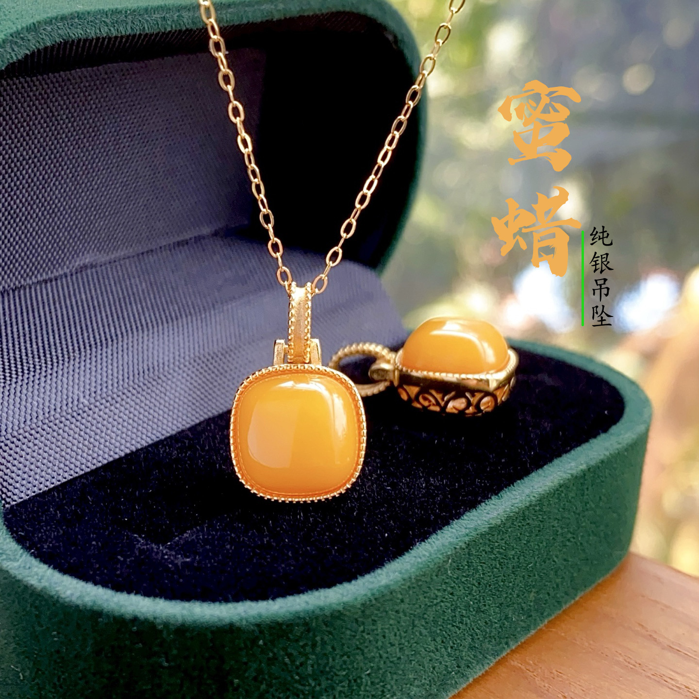天然老蝋琥珀蜜蝋方牌ペンダントS925純銀アクセサリージュエリー生放送ソース