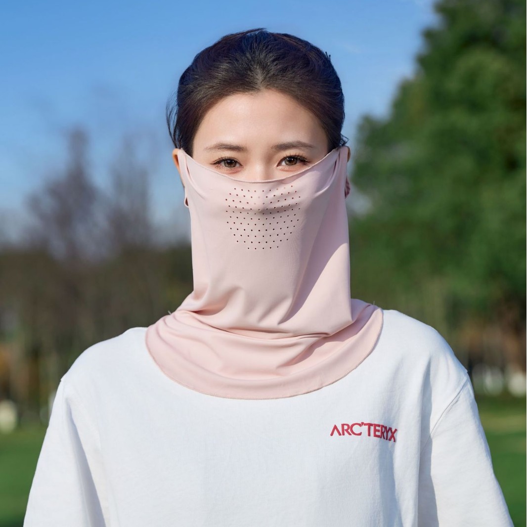 夏の日焼け止めマスクで顔を隠します。