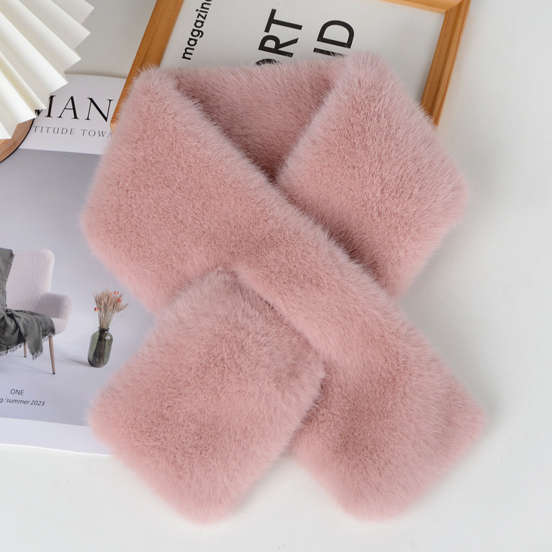 秋冬の女性用ぬいぐるみスカーフ、クロスデザイン、イミテーションレッキスラビットファー、キュートで多用途なスカーフ、ストライプ、暖かく厚みのあるファー襟付き
