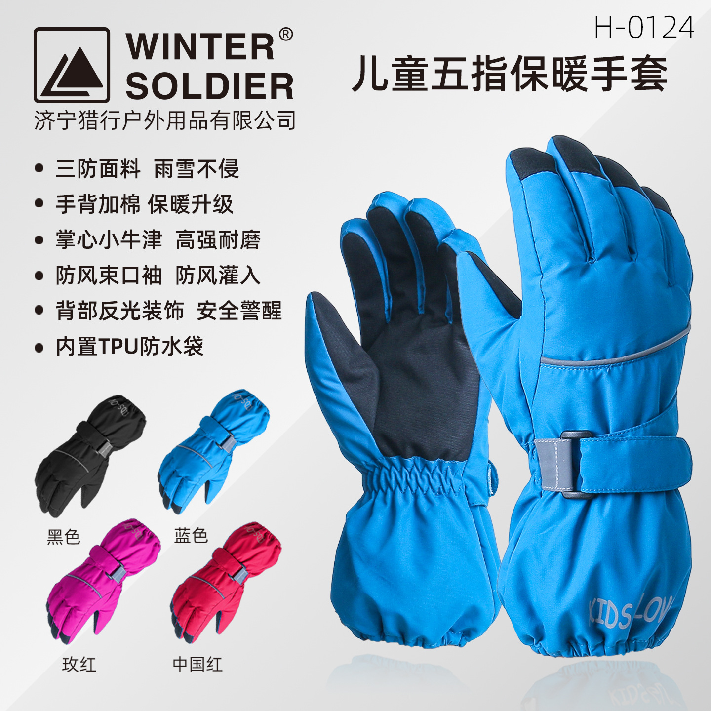 メーカー現物冬児童分指保温手袋純色防風防水耐磨耗五本指アウトドアスキー手袋