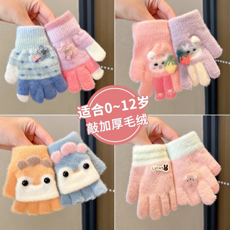 新型子供冬ニット手袋小羊漫画ストラップ手袋厚いベルベットニット保温防風手保護