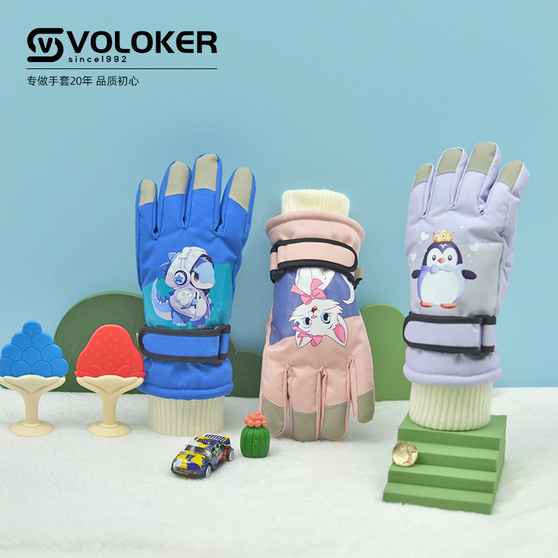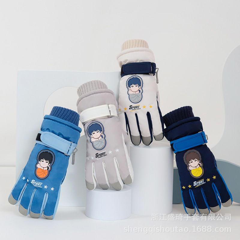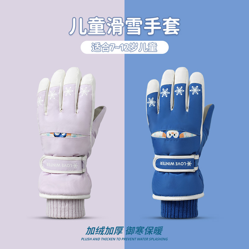 7-14歳子供用手袋冬防水保温ベルベット厚手五本指手袋漫画プリントスキー乗用手袋