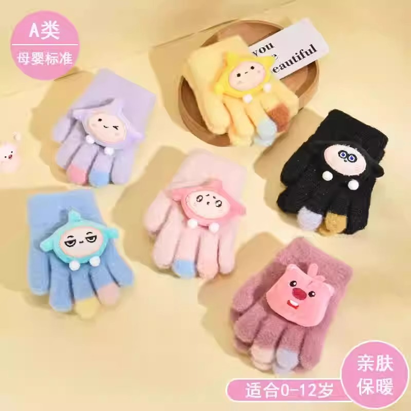 2024年越境ニットプリント子供用指付き手袋、男女兼用ベビー用エンボス加工冬用保温手袋、漫画プリント