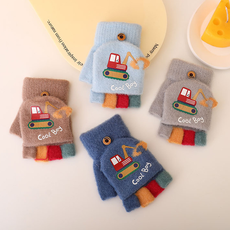 2024新型ショベル児童手袋男児秋冬漫画赤ちゃん半指ニット子供防寒保温