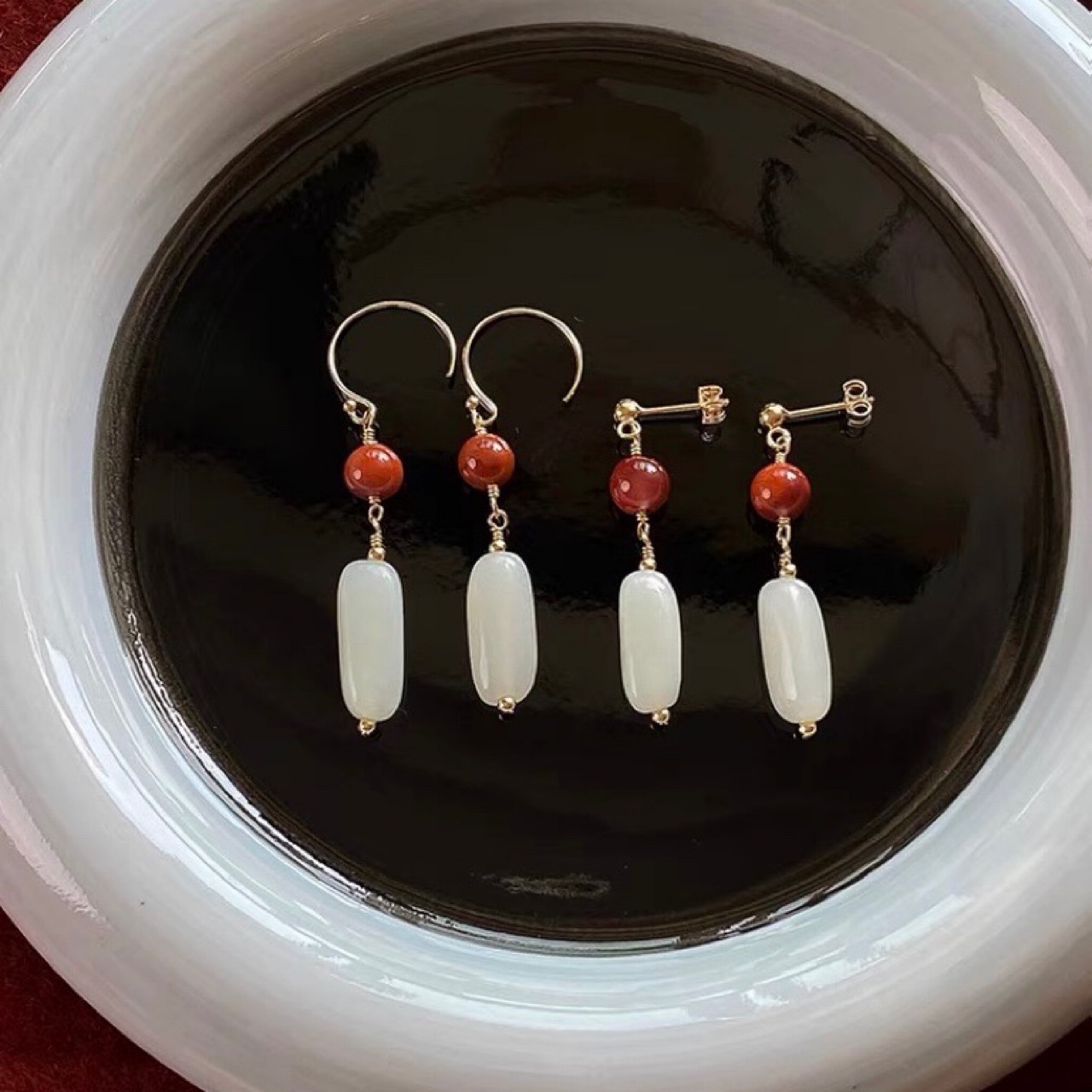 温婉14k包金天然南紅瑪瑙と田玉のイヤリング