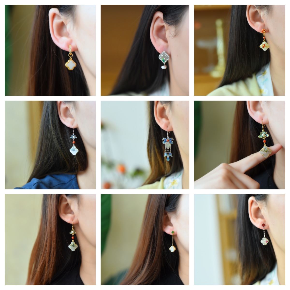 925銀象眼和田玉四葉草流蘇宮廷風国潮気質レトロ古風女史イヤリング