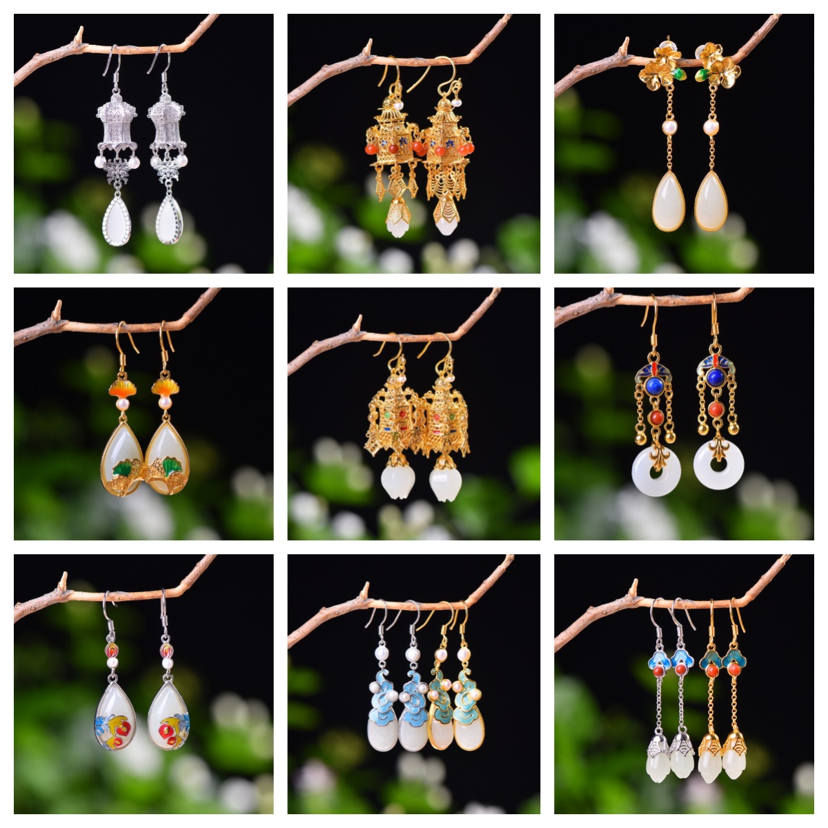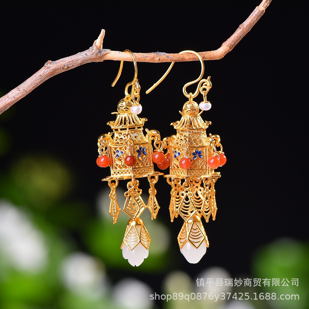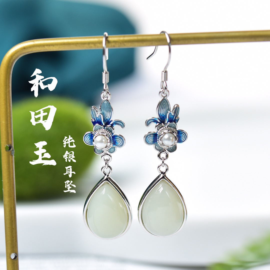 S925銀モザイク和田玉水滴エナメルイヤリング和田玉亭台楼閣イヤリング平安環多宝イヤリング