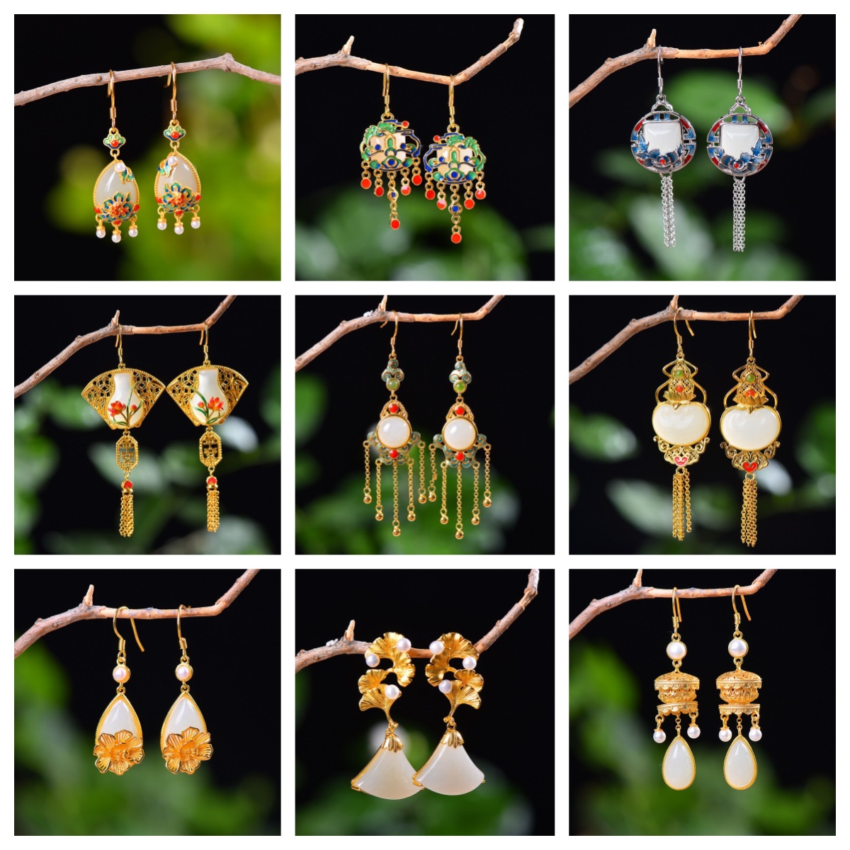 S925モザイク和田玉平安環水滴路通耳落和田玉復古エナメル蝶イヤリング