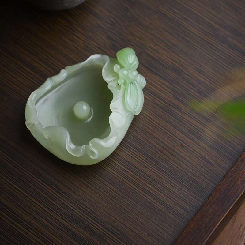 玉器工芸品天然新疆と田玉青海材料の古風な青々としたトンボ蓮の葉玉の筆洗証明書