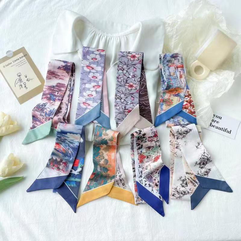 シルクスカーフ、韓国風夏プリント、二層ロング斜め包みリボン、小さなスカーフ、ヘッドスカーフ、ヘアバンド