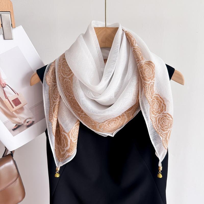 2024春夏の新型金球格子シフォンのシルクタオルの女性のプリントの薄いタイプのマフラーの組み合わせの日焼け止めの贈り物のガーゼ