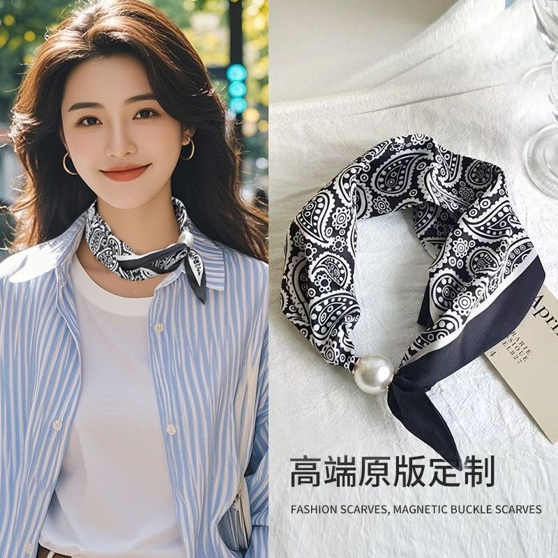 2025 新作春夏薄型パールネックレス磁気バックル怠惰なシルクスカーフ女性のペンダントスカーフ鎖骨チェーンスカーフ