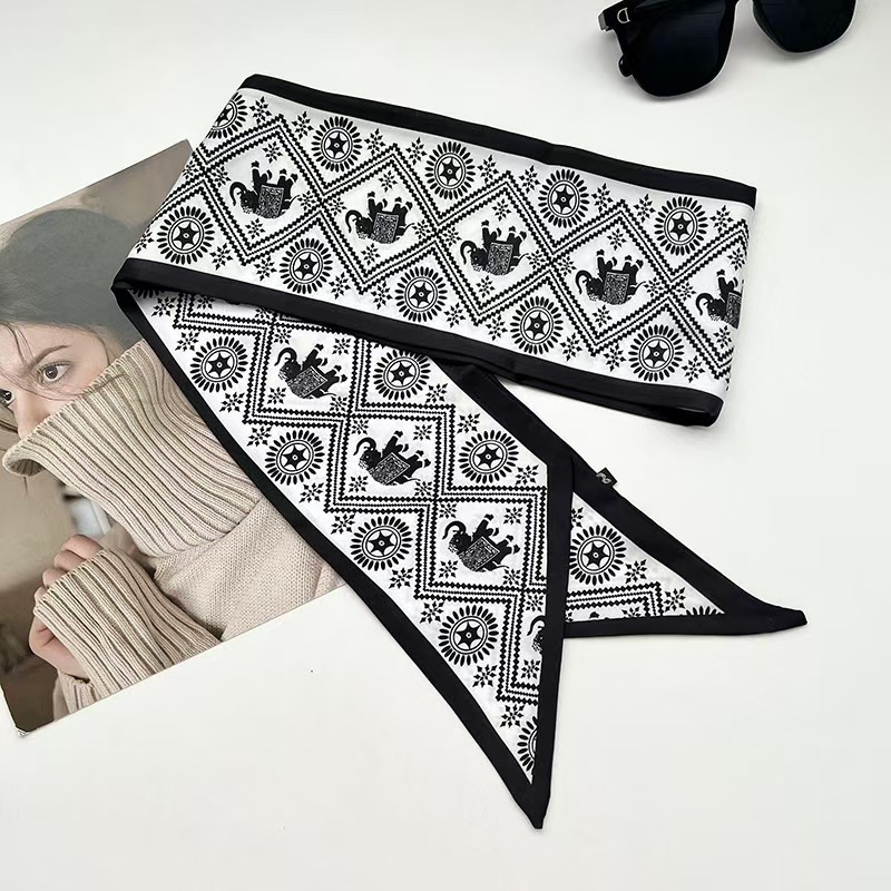 黒と白のシンプルなカシューフラワーフォイルスカーフ、ハイエンドのエスニックスタイルのウエストスカーフ、装飾スカーフ、スカーフ、職場装飾スカーフ