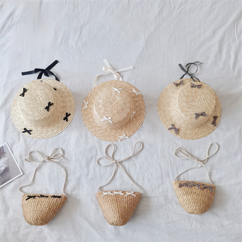 2024夏の新しい成人児童の草の帽子の女の子の小さいバッグの0財布の蝶結びの波の辺の日よけの帽子
