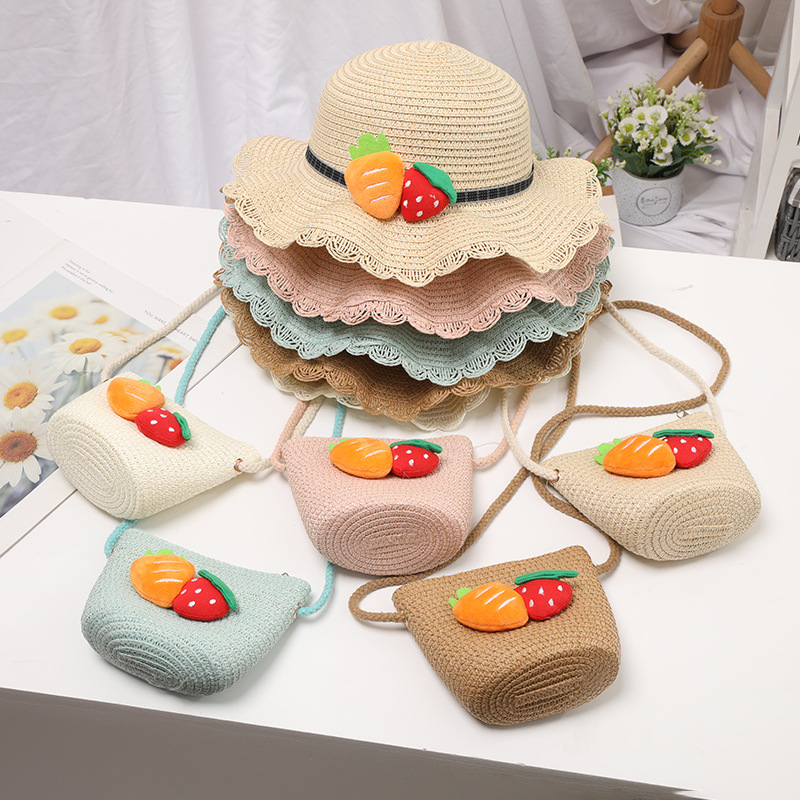 夏の新作子供帽子草編みバッグセット赤ちゃん小銭入れミニ可愛いキッズ飾り斜めがけバッグ