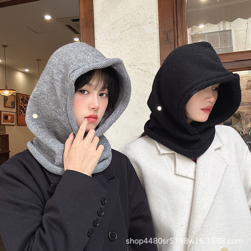 純色一体式包頭帽子流行単品女性冬保温帽子マフラー毛糸ニット首カバー
