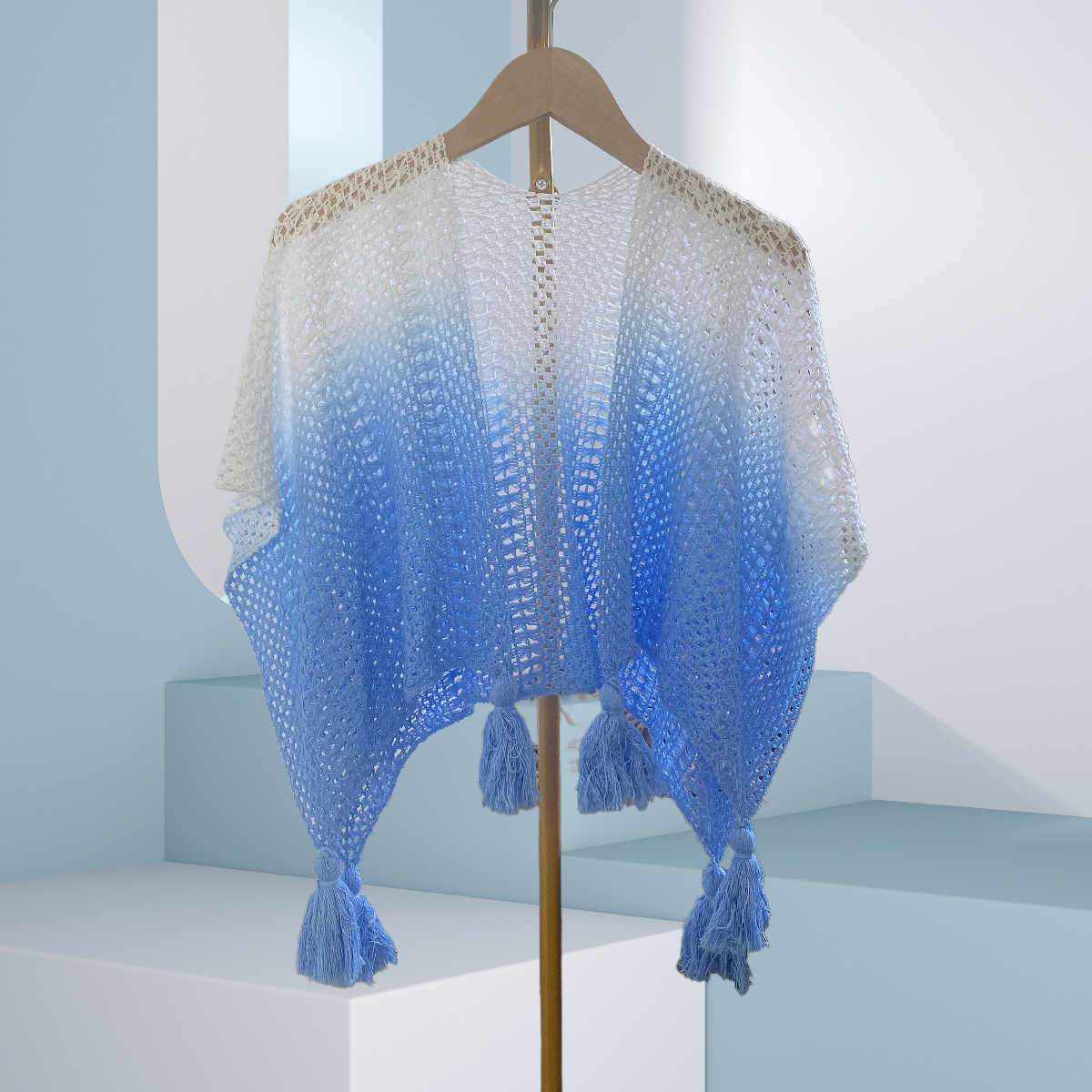 民族風の純色の透かし編みの大きいマントは外に飾られています。