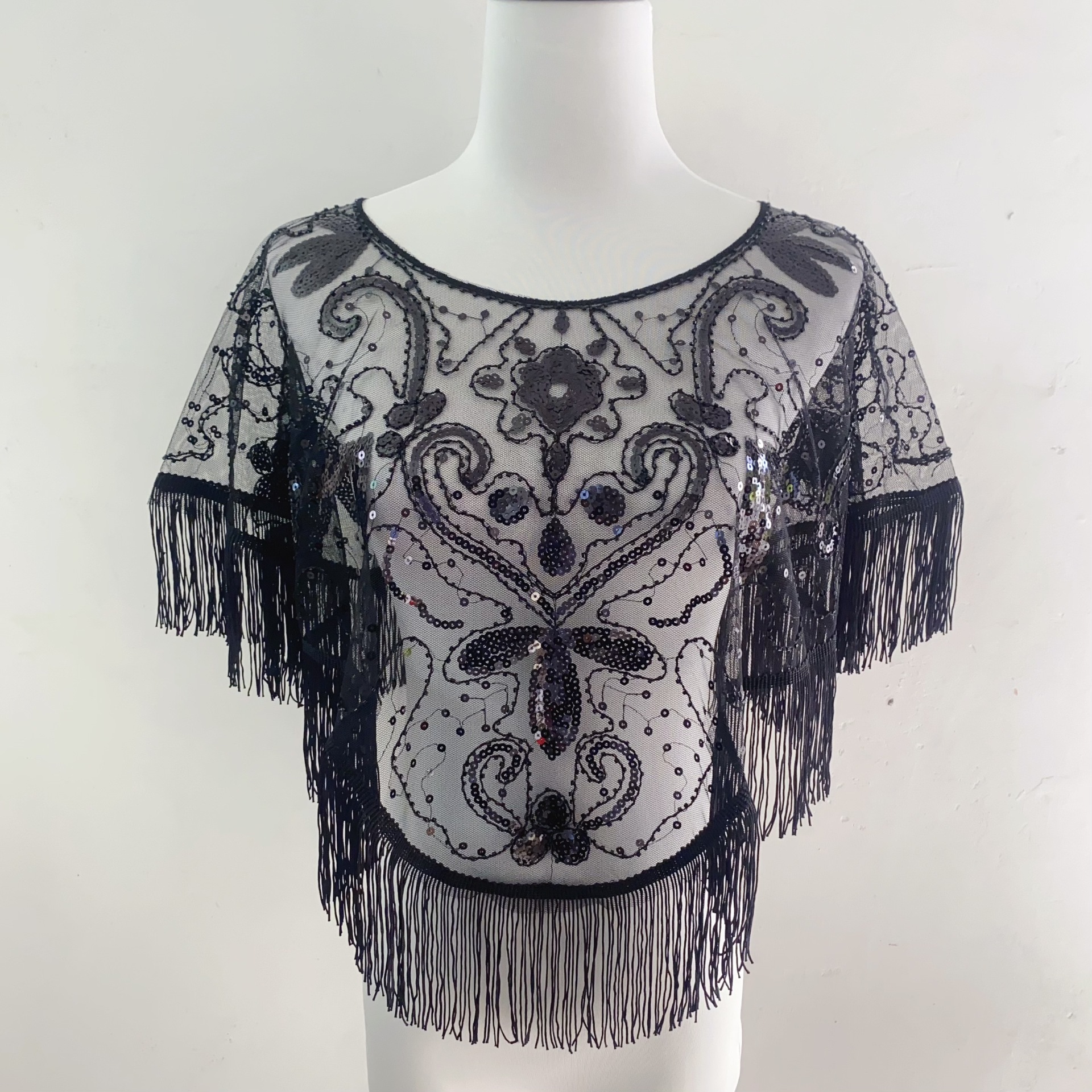 スパンコール付きショール、イブニングドレス、パーティー、宴会、婦人服、ヨーロッパとアメリカのアマゾン向けアウター、フリンジ付きメッシュ、大きいサイズのケープ
