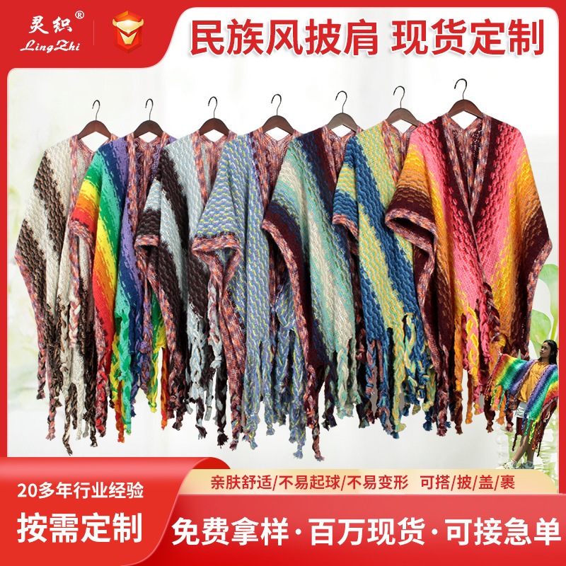 2025 新しいスタイルの非衝突エスニックスタイルショール旅行ニットマントレトロレインボーストライプカーディガン