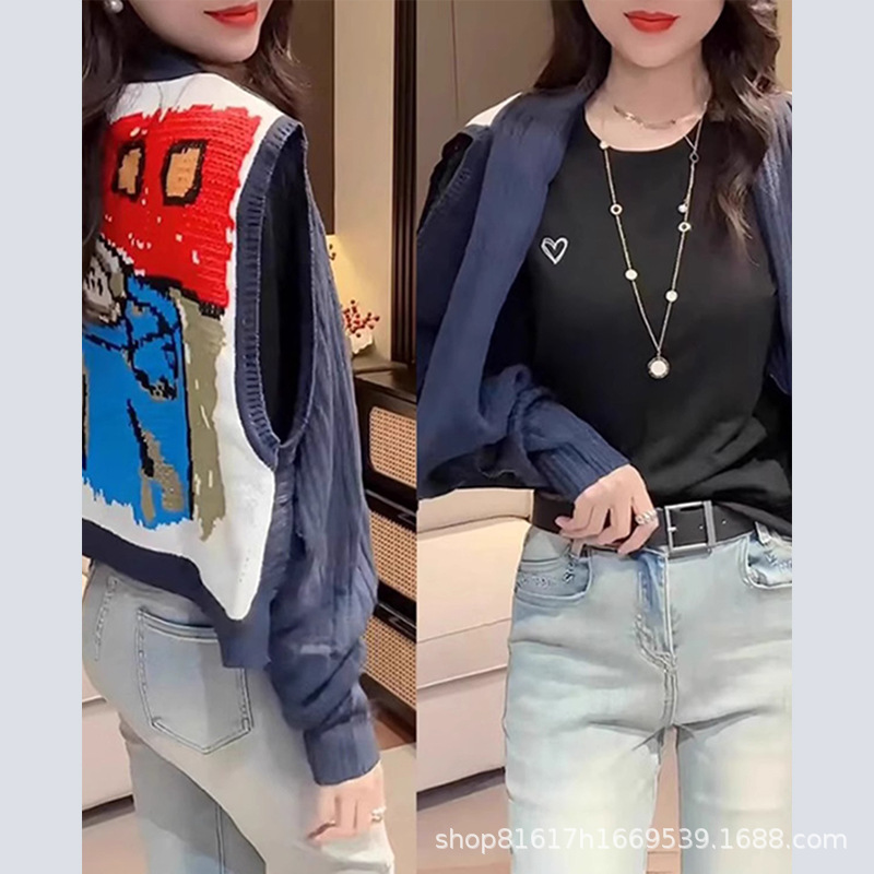 2025 春夏の新ハイエンドレディースファッション漫画カラーブロックニットベストスリムで多用途なツーウェアショールアウターレザー